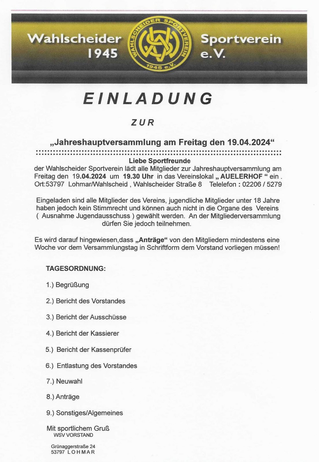 wir möchten Euch herzlich zur diesjährigen Jahreshauptversammlung am Freitag, den 19.04.2024 um 19:30 Uhr im Aueler Hof einladen. Hier findet ihr die offizielle Einladung sowie die Tagesordnung.