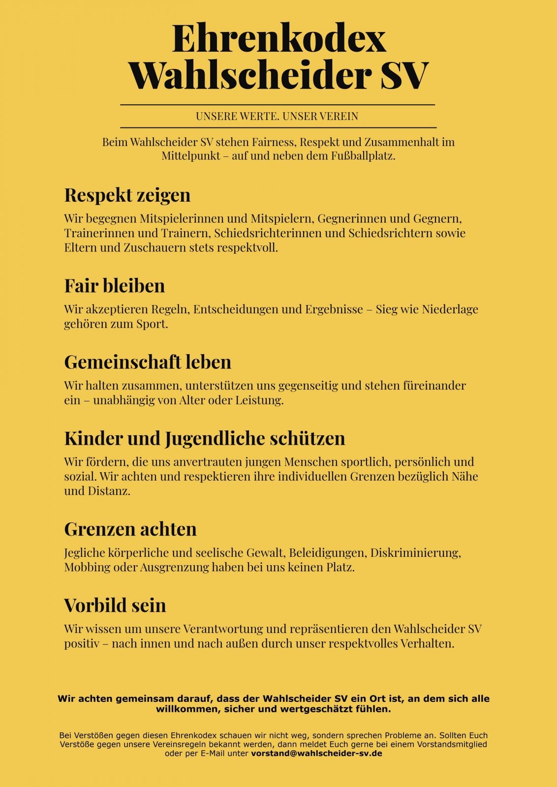 Grenzverletzungen, Diskriminierung, Gewalt oder sexualisierte Belästigung haben im Wahlscheider SV keinen Platz. Aus diesem Grund haben wir unter anderem einen Ehrenkodex für unseren Verein eingeführt. Er beschreibt verbindlich die Werte und Verhaltensgrundsätze, die für alle Mitglieder gelten – unabhängig von Alter, Funktion oder Rolle im Verein.