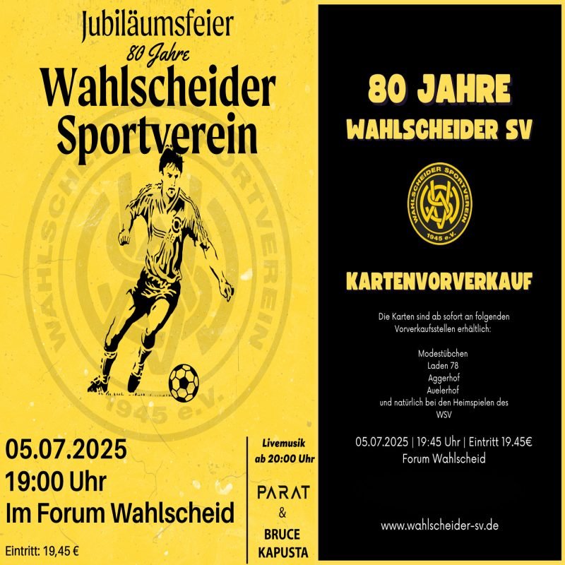 Es erwartet Euch ein unvergesslicher Abend mit Catering & leckeres Essen, Livemusik ab 20:00 Uhr mit PARAT & Bruce Kapusta, Gute Stimmung, tolle Gäste und natürlich viele sportliche Erinnerungen! Sichert Euch jetzt Eure Tickets – der Vorverkauf hat bereits begonnen! Tickets gibt es an den folgenden Vorverkaufsstellen in Wahlscheid: Modestübchen, Aggerhof, Laden 78 und im Auelerhof. Kommt vorbei, feiert mit uns und lasst uns gemeinsam auf 80 Jahre Vereinsgeschichte zurückblicken – und voller Freude in die Zukunft blicken!🖤💛